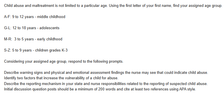 In xxx childhood, ages x to x, there are visible warning signs of abuse that appear in physical and emotional forms. In terms of physical signs, nurses may observe bruises, burns, or injuries that do not match the explanation provided by caregivers (Yoon et al., 2022). For instance, a caregiver may say a child fell off a bed, yet the bruises appear in places unlikely from such a fall, such as the back or thighs. Repeated emergency visits for injuries may also create suspicion to indicate a child is experiencing maltreatment and abuse (Yoon et al., 2022). On the other hand, a nurse may notice emotional signs such as a child appearing fearful, withdrawn, and anxious around adults. Some children regress in behavior, such as … To access full answer, use the purchase button below.