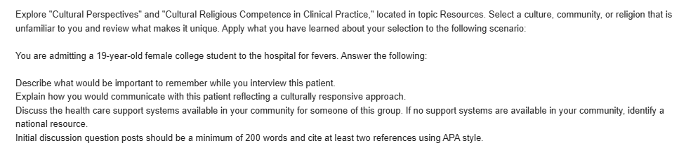 Explore “Cultural Perspectives” and “Cultural Religious Competence in Clinical Practice,” located in topic Resources. Select a culture, community, or religion that is unfamiliar to you and review what makes it unique. Apply what you have learned about your selection to the following scenario: