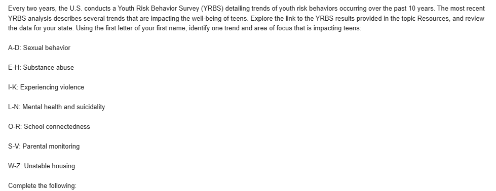 Every two years, the U.S. conducts a Youth Risk Behavior Survey (YRBS) detailing trends of youth risk behaviors occurring over the past 10 years. The most recent YRBS analysis describes several trends that are impacting the well-being of teens. Explore the link to the YRBS results provided in the topic Resources, and review the data for your state. Using the first letter of your first name, identify one trend and area of focus that is impacting teens: